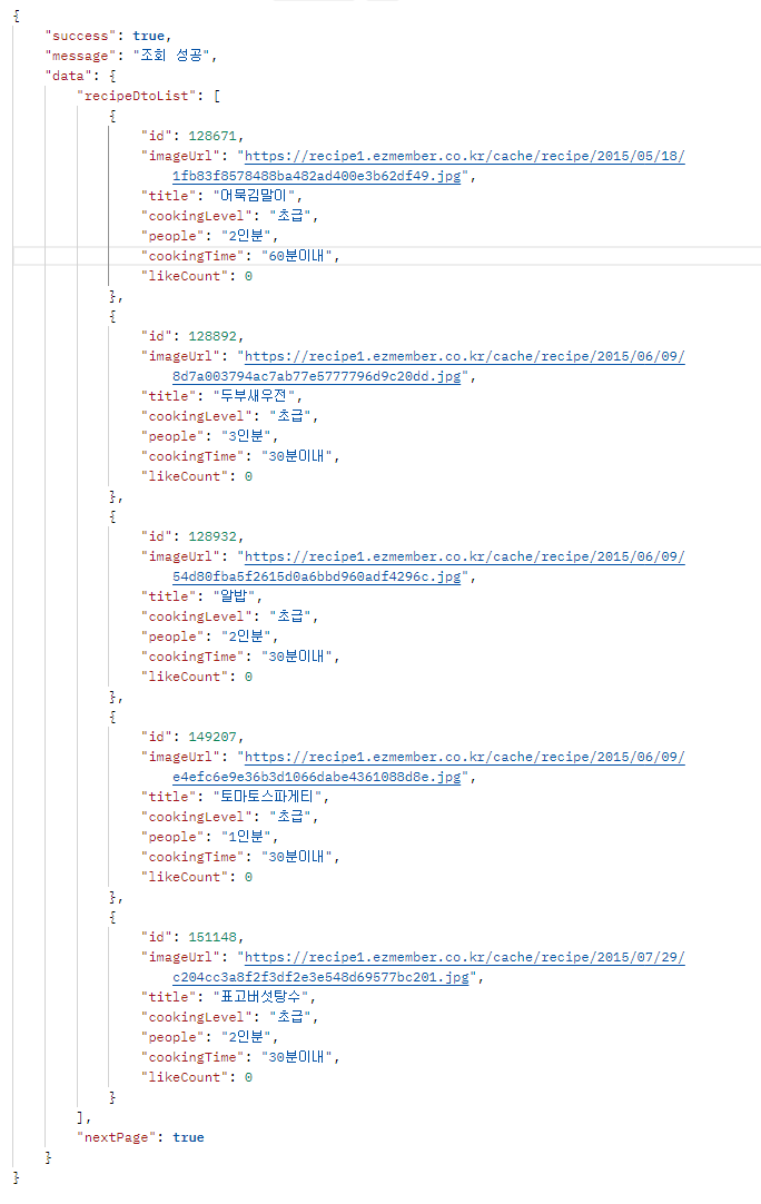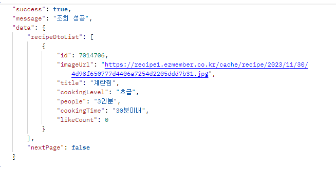 재료가 입력할 때마다 해당 재료의 대해서 검색할 수 있도록 like '재료'가 추가될 수 있도록 했으며, 일반적인 join을 통해서 레시피의 정보를 가져오도록 쿼리를 작성했습니다. 이제 조회된 데이터를 Dto로 변환하며, 다음 페이지의 존재여부를 파악해 다음 페이지가 존재할 시 +1의 데이터를 지우고 다음 페이지의 존재여부를 확인할 수 있게 했습니다.