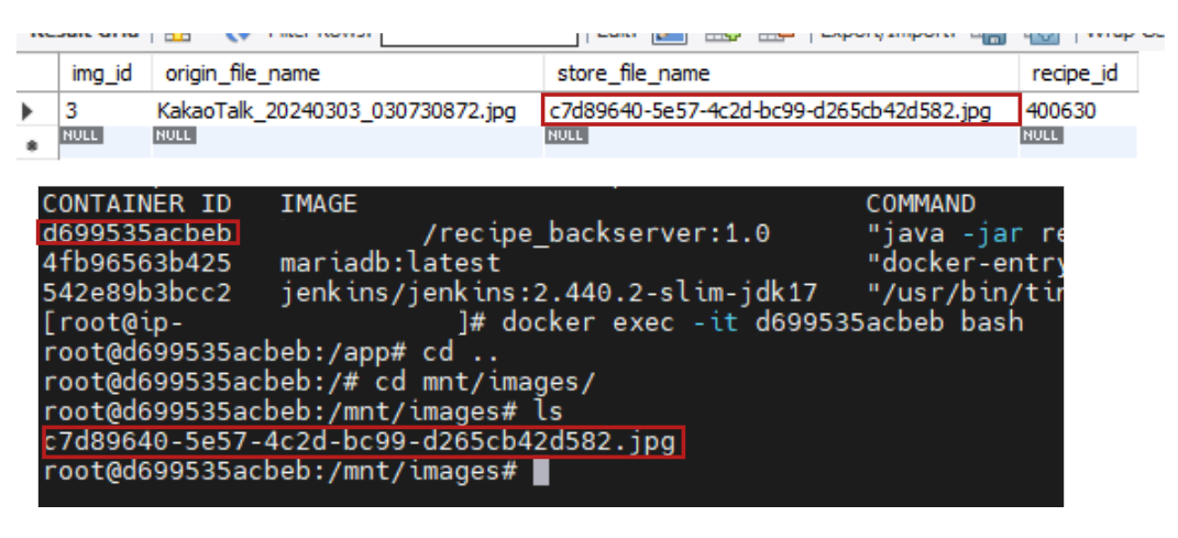 store_file_name으로 DB에 저장된 파일명이 저장되어 있으며 , d699535 acbeb라는 컨테이너 ID 내부에 동일한 이미지 파일이 저장돼있는 것을 볼 수 있다.