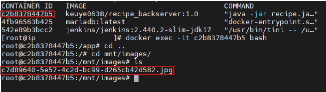 컨테이너 ID는 c2b8378447b5로 바뀌어서 새로운 서버가 실행됐지만 서버 내부에는 동일한 이미지 파일이 있는 것을 볼 수 있다.