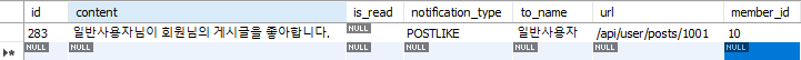 DB에더 알림 타입이 게시글 좋아요로 저장되며 발신자는 일반사용자이며 수신자가 10으로 저장된 것을 볼 수 있습니다.!