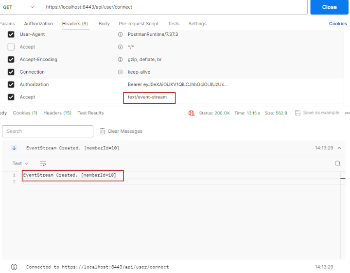 실제 웹 연결 시에도 요청 헤더를 보게 되면 text/event-stream연결 시에 EventStream 폼이 생기며 ID 값의 서버에서 생성해 준 (사용자 id+임의의 값) emitter_id를 전달해 준 것을 볼 수 있다.
