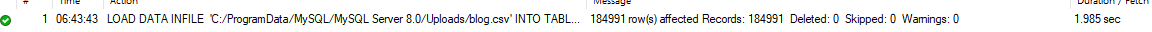 LOAD DATA LOCAL INFILE 'C:/ProgramData/MySQL/MySQL Server 8.0/Uploads/blog.csv'