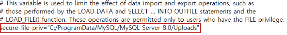 파일 경로에서 (Windos 기준) 경로를 'C:/ProgramData/MySQL/MySQL Server 8.0/Uploads/' 다음 경로를 작성 후 파일명을 작성해줘야 한다. 안 그러면 1209 에러가 뜨면서 사용할 수 없게 된다. 이 에러는 파일의 입출력 경로가 다를 경우에 발생하는 에러이다. 기본적으로 mysql의 구성파일을 보면 다음과 같이 기본 경로가 설정된 것을 볼 수 있다. (수정하면 수정한 경로로 저장이 된다.)