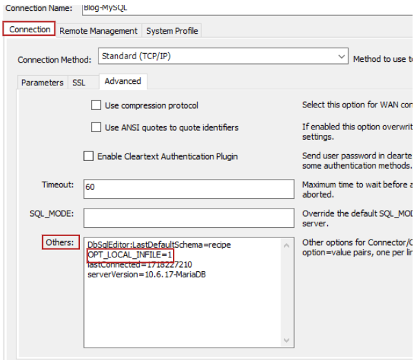 - Advanced탭의 Others에 OPT_LOCAL_INFILE=1 입력합니다.