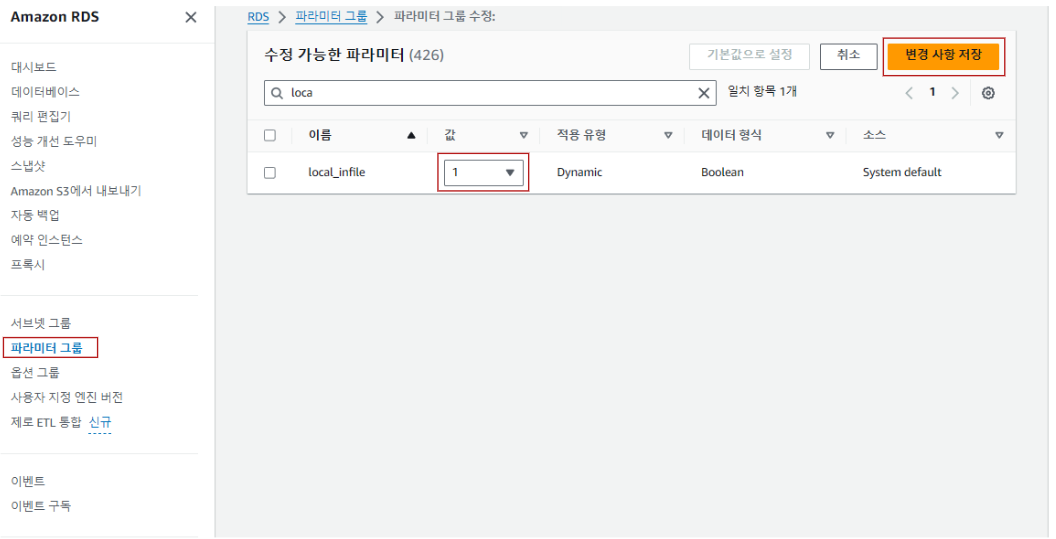 파라티터 그룹 → 파라미터 편집 → local_infile 검색 → 값을 1로 변경
