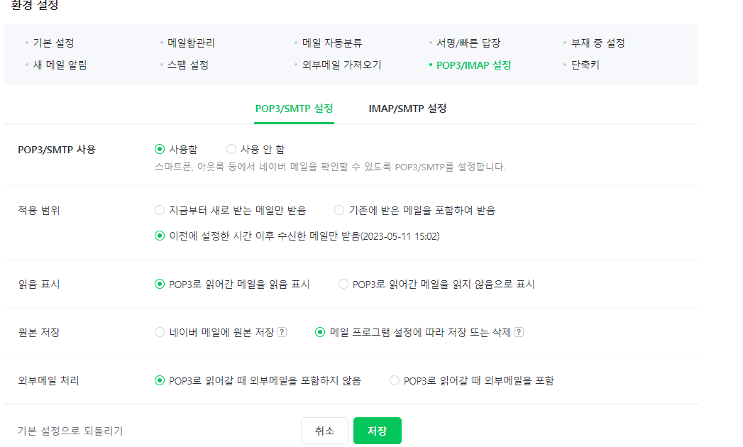- 네이버 메일로 들어가 환경설정부분에서 POP3/IMAP설정을 사용함으로 설정해야 이메일을 보낼수있다.