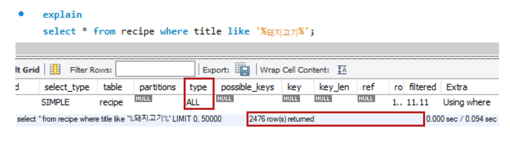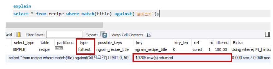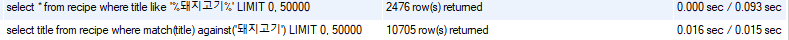 하지만 기본적인 MySQL에서 지원해 주는 것만으로도 많은 성능 개선되는 것을 볼 수 있습니다. 아래와 같이 같은 돼지고기를 검색하면