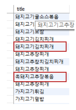 조회된 데이터를 보면 "돼지", "고기" 단어가 들어간 단어가 조회되면서 데이터가 많은 데이터를 조회되는 것을 볼 수 있다.