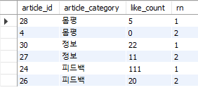 위와 같이, Article 테이블에서 카테고리별로 좋아요 순으로 상위 2개의 게시물을 조회하는 방법에 대해 설명드리겠습니다.