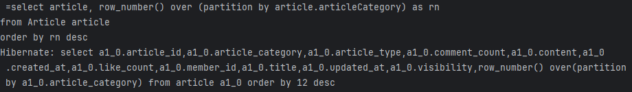 JPAQuery<Tuple> rowNumber = jpaQueryFactory.select(article, SQLExpressions.rowNumber().over().partitionBy(article.articleCategory).as("rn"))