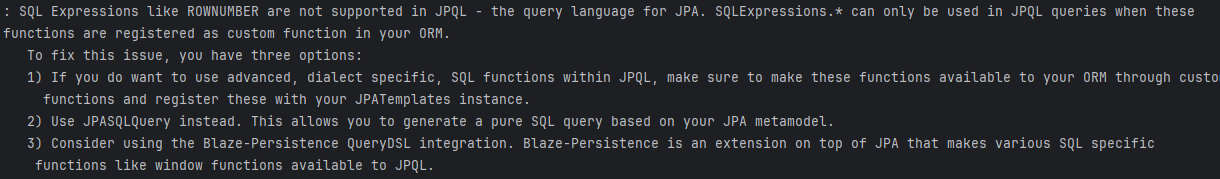 - JPQL 쿼리 언어는 SQL 함수인 ROW_NUMBER()와 같은 고급 SQL 표현식을 직접 지원하지 않는다. 따라서, 이를 사용하기 위해서는 JPQL 템플릿을 사용자 정의하여 ORM에 이러한 함수가 사용될 수 있도록 설정해야 하는 오류가 발생합니다.