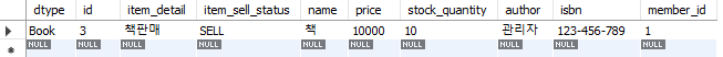 사용자가 상품을 등록할때에는 여러 개의 상품을 등록할 수 있으며, 상품은 사용자의 한 명으로만 매핑되도록 설계했으며 아이템엔티티는 상속을 통해서 Book을 설계하도록 했습니다.