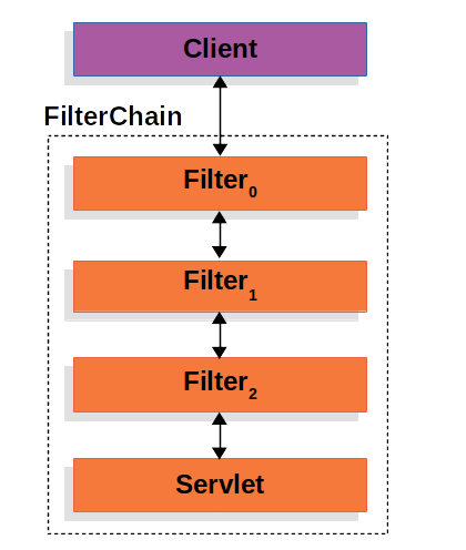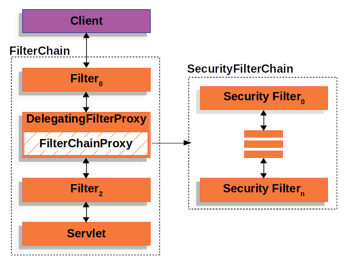 일반적으로는 보안이 적용되지않은 상태는 Clinet -> Servlet 로 진행되지만, 시큐리티가 적용된 상태는 중간에 필터를 둬서 보안을 적용한다. 이러한 필터가 여러개를 함께 사용될수 있다. 이를 묶어 FilterChain 이라고 부른다.