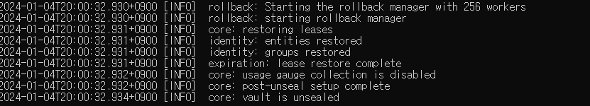 봉인이 해제되었다고 로그가 나오게된다. 이제 볼트를 사용할 준비가 되었다.