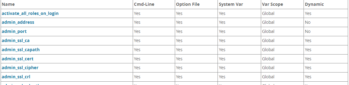- Cmd-Line : MySQL 서버의 명령행 인자로 설정 될 수있는지 여부를 나타낸다.