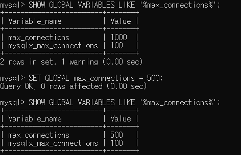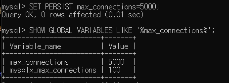 SHOW GLOBAL VARIABLES LIKE '%max_connections%'; 조회