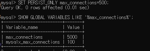 만약 재시작 시에 변경 내용을 저장하고싶다면 SET PERSIST_ONLY명령어를 사용하면된다.