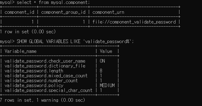 MySQL 서버에서 비밀번호의 유효성을 체크 규칙을 적용하려면 validate_password 컴포넌트를 설치해야한다.