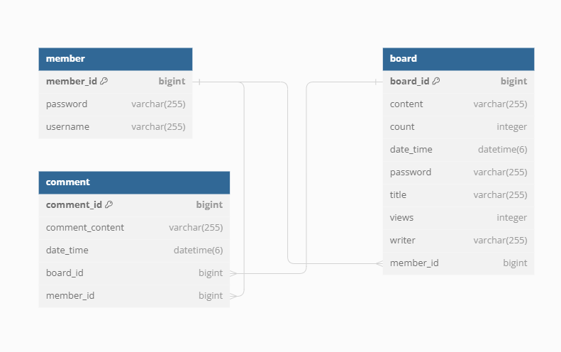 프레임워크나, 언어, DB등을 이론적로 공부를 하고난후에 한번 토이 프로젝트를 통해서 실습을 해보고싶었다. 그래서 이번에 간단한 CRUD를 통해 게시판을 만들어봤다. 혼자서 기획하고 코드를 작성했기 때문에 이상하거나 오류가 날수있습니다.. 그런 부분은 댓글을 통해 공유해주시면 감사하겠습니다.