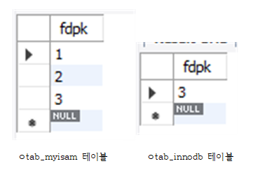 - MyISAM 엔진으로 실행하는 tab_myisam 테이블 과 InnoDB엔진으로 실행하는 tab_nnodb 테이블을 생성후 각각 값(3)을 넣어준다.