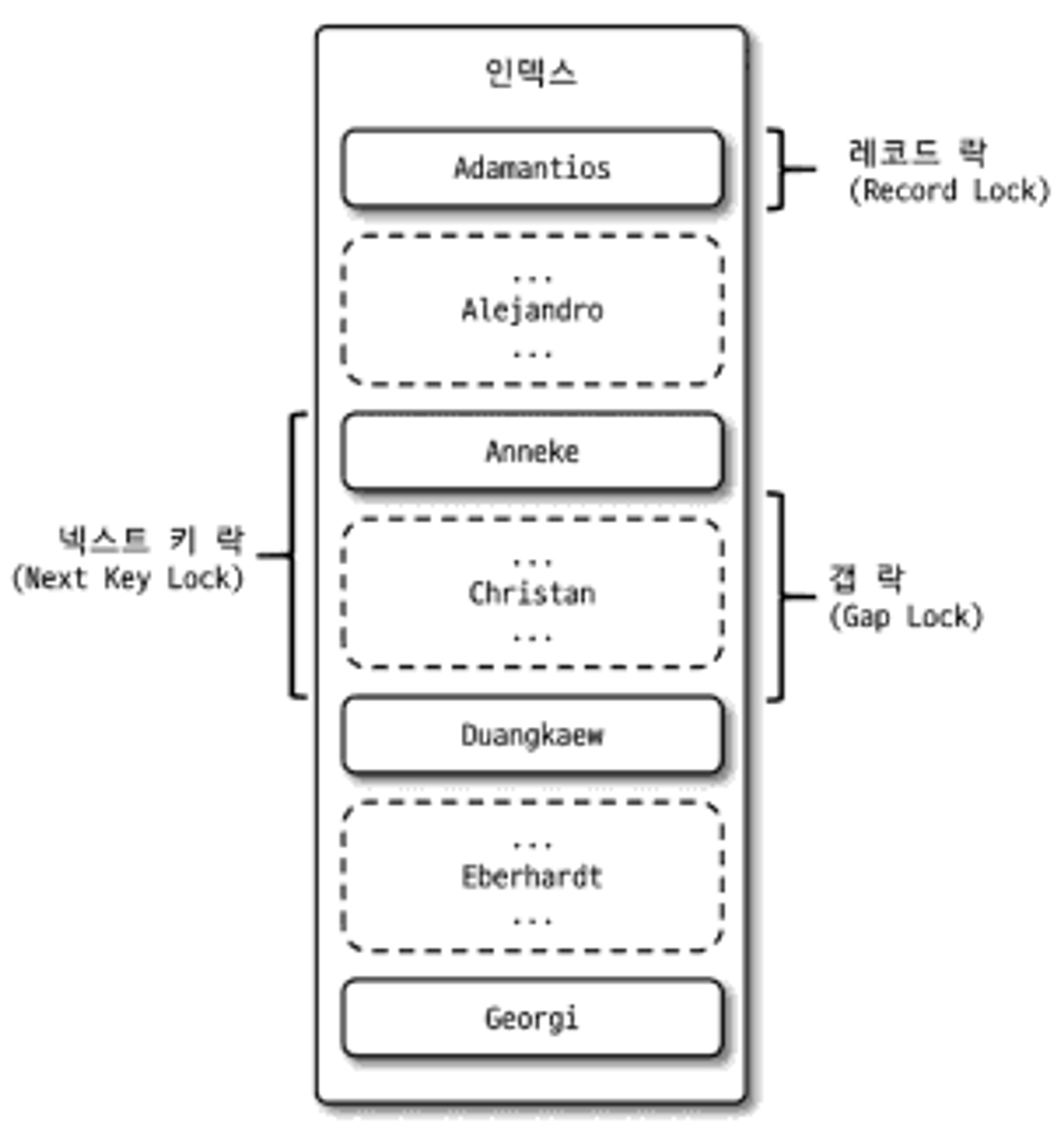 레코드 자체를 락을 거는것이 아닌 레코드와 인접한 레코드 사이의 간격만은 잠그는것이다.(INSERT 구문 제어)