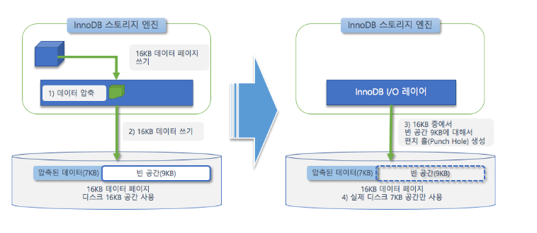 - MySQL 서버는 디스크에 압축도딘 결과를 7KB로 기록(7KB에 9KB의 빈데이터 저장)