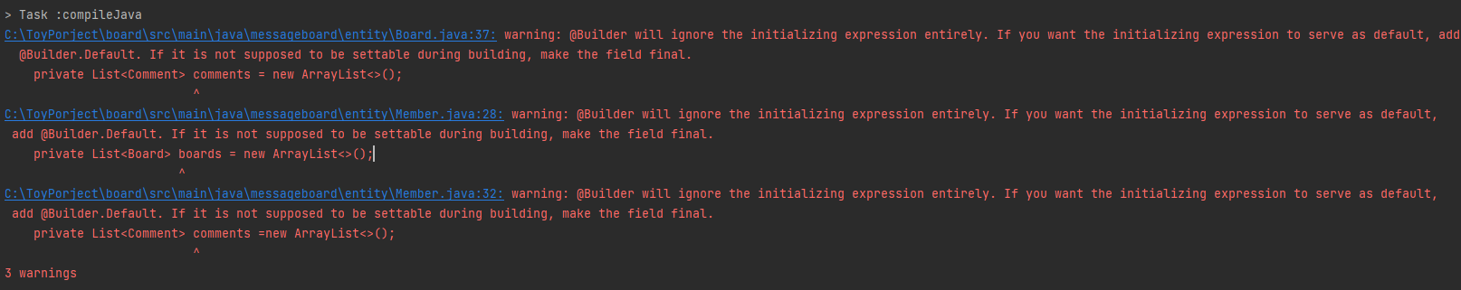 - If you want the initializing expression to serve as default, add @Builder.Default: 기본 값으로 사용한다면 @Builder.Default를 사용하세요