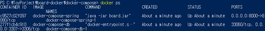 도커 컴포즈를 통해서 한번만 실행했는데 실행중인 컨테이너를 보면 두개가 실행되어 있는것을 볼수있다 . 이처럼 도커 컴포즈는 여러개의 컨테이너를 묶어서 한번에 실행할수있다.