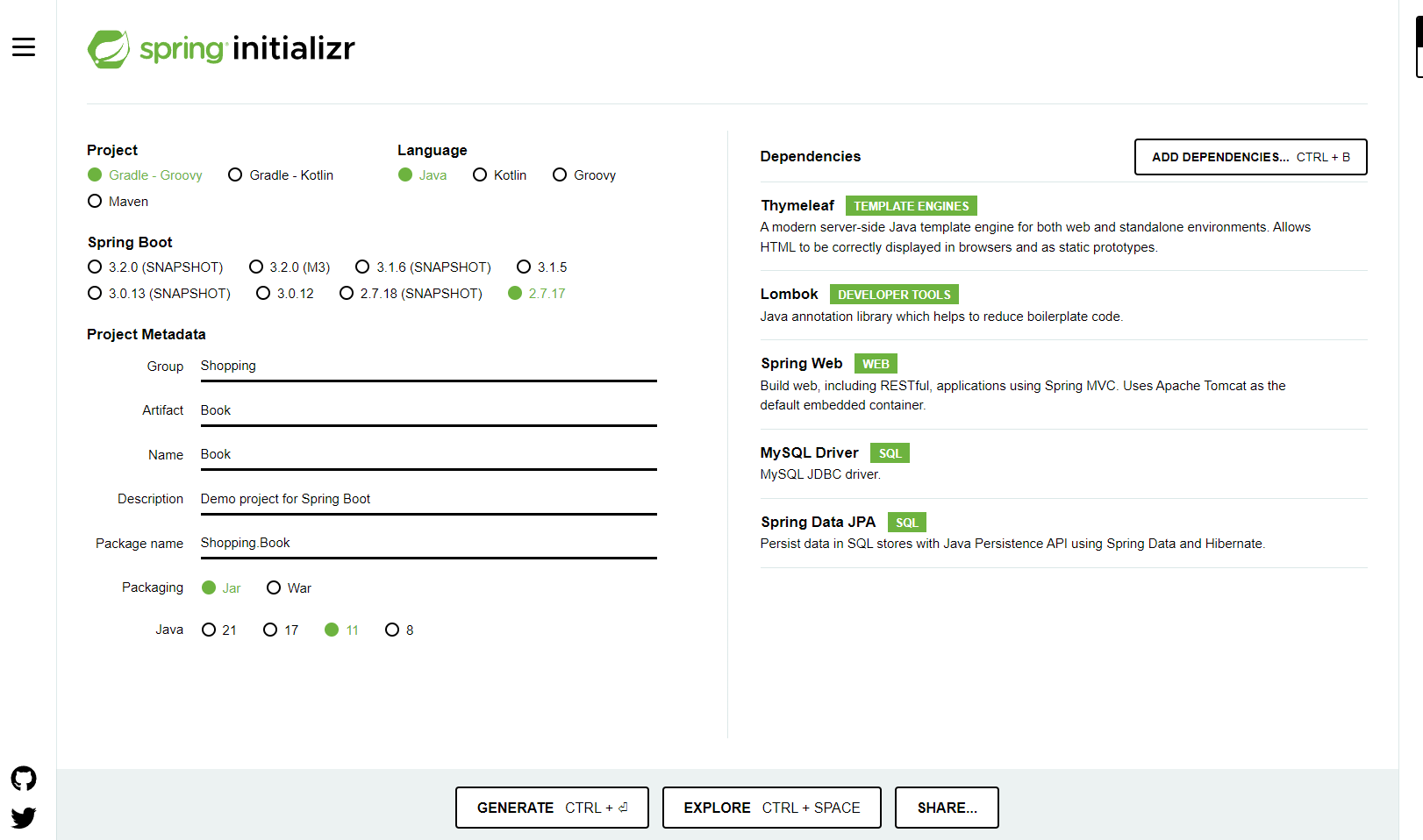5개를 추가해주고 GENERATE를 눌러 다운받아 압축을 푼후에 자신이 사용할 폴더안에 압축을 푼 파일을 넣어준다. 저는 C:\shopping 파일을 생성후 폴더안에 압출을 풀었습니다.