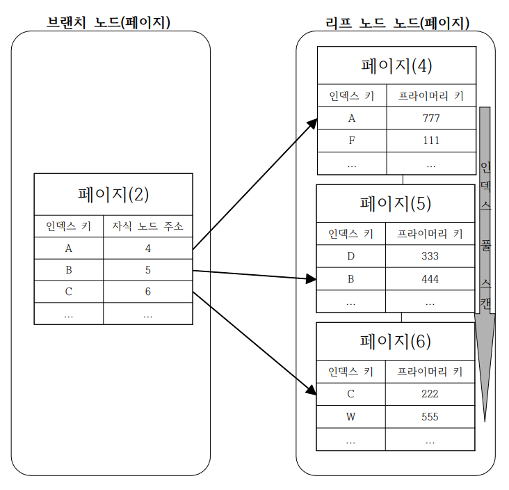 - 탐색된 위치부터 필요한 만큼 인덱스를 차례대로 쭉 읽는다. 이과정을 인덱스 스캔(Index scan)이라고 한다.