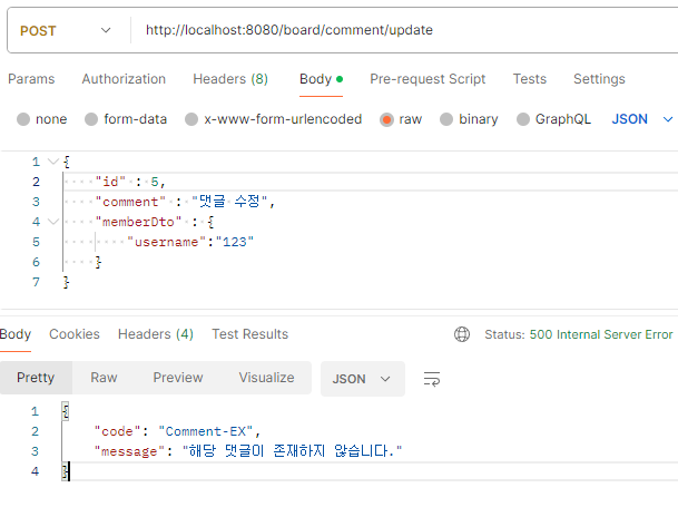 게시글이 존재하지 않을 시에는 500 상태코드와 함께 오류값이 전달됩니다.