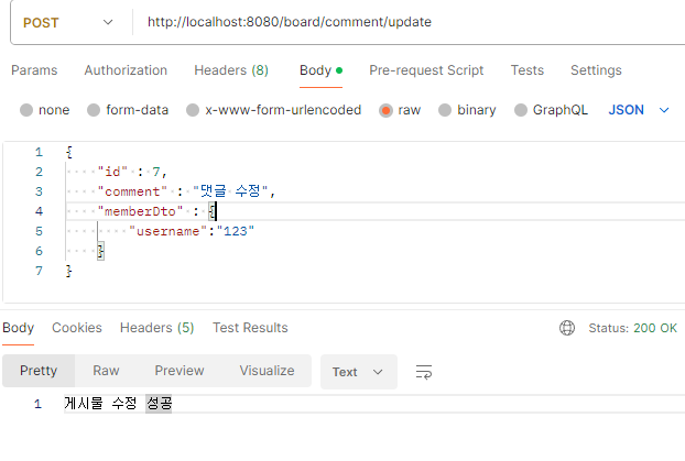 게시글을 성공하면 "게시글 수정 성공"이라고 값이 넘어오게 됩니다.