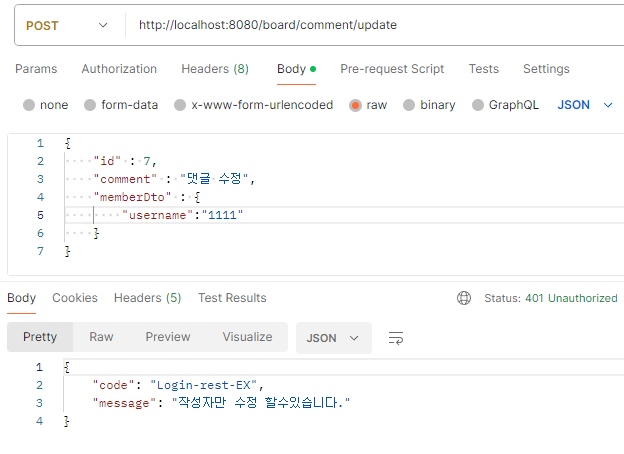 작성자가 아닐 시에는 401 상태코드와 함께 오류값이 전달되는 것을 볼 수 있습니다.