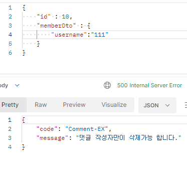 댓글 작성자가 아닌 다른 사용자가 삭제 시 상태코드 500과 함께 오류 메시지를 보여준다.