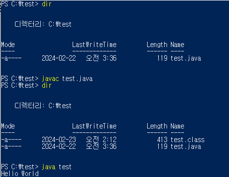 test.java 파일을 컴파일하여 바이트 코드로 변환된 test.class 파일을 생성합니다.