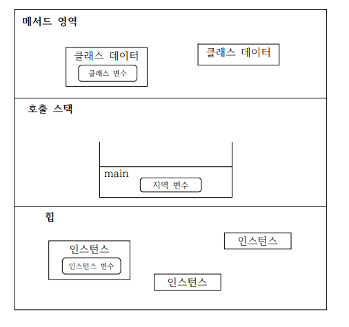- 힙(heap) : 인스턴스가 생성되는 공간으로, 프로그램 실행 중에 생성되는 인스턴스와 인스턴스 변수가 함께 저장됩니다