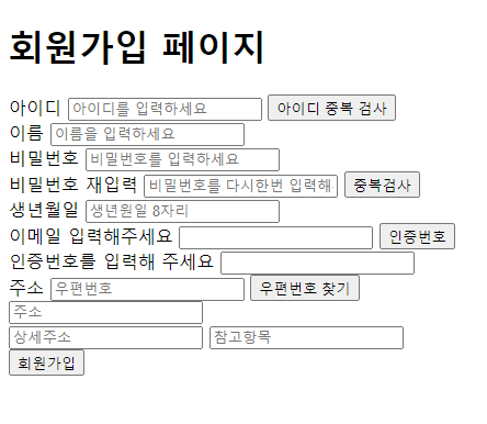 아이디 중복검사, 비밀번호 중복검사, 인정번호전송,우편번호찾기는 구현하지 않았다. 하나씩 구현할 예정입니다~!