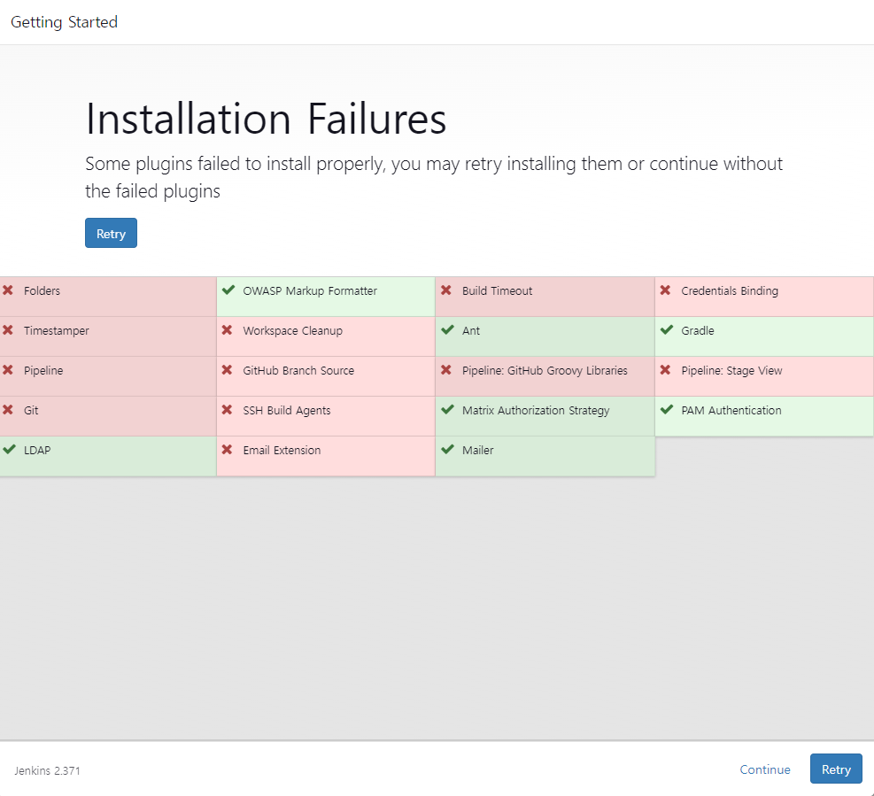 다음과 같이 설치가 안되는 것을 볼 수 있다. 여러 구글링과 혼자 노력해 본 결과 현재 사용 중인 jdk 버전과 다운로드한 버전이 맞지 않아서 플러그인이 설치되지 않는 것 같았다. 현재 다운로드한 jenkin버전은 2.371 버전이다. 근데 jdk17으로 다운로드할 때 설치가 되지 않았다