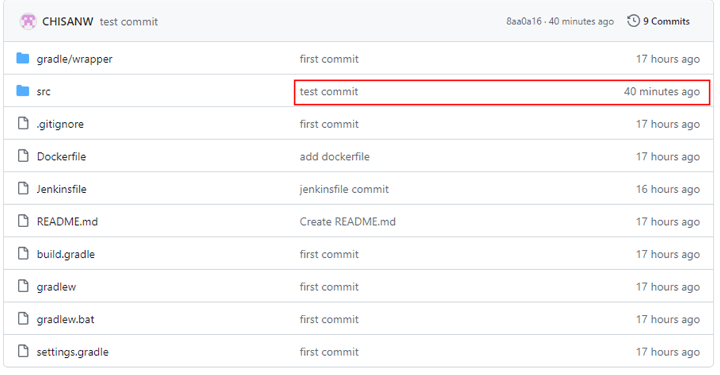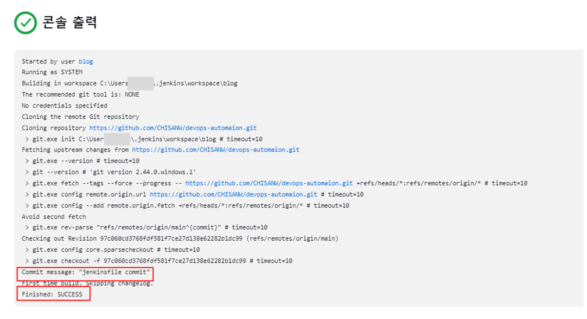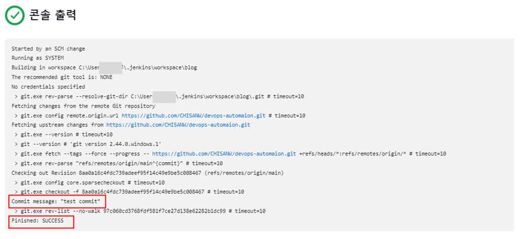 변경한 커밋메시지 "test commit"가 나오며 SUCCESS 가 됐다는 것을 볼 수 있다.
