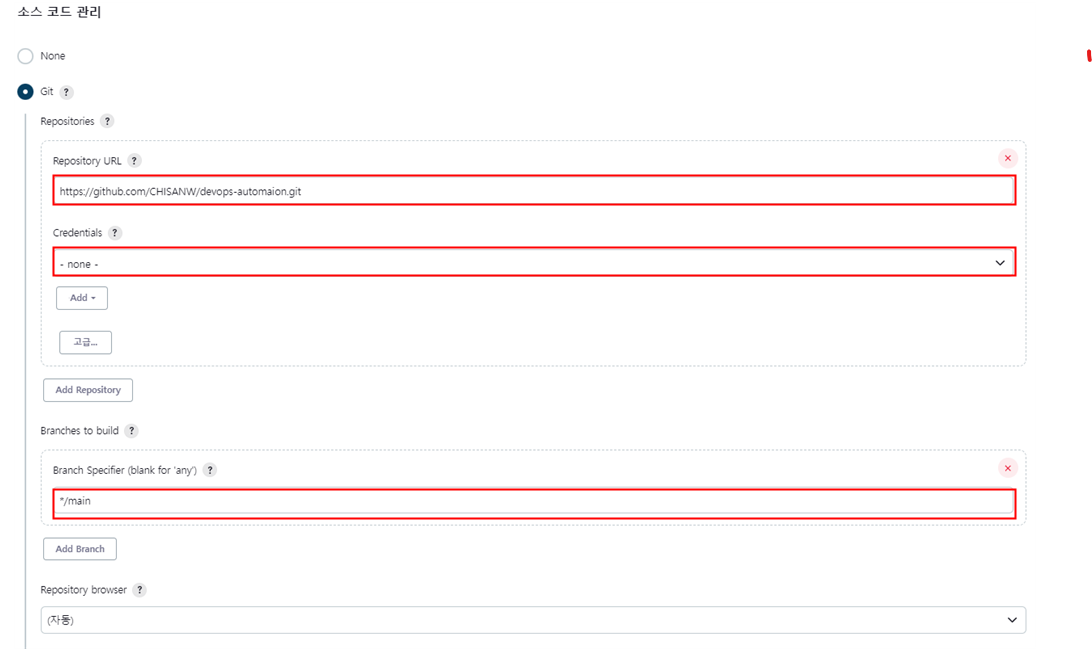 (깃 리파지토리 주소가 없을시에는 https://github.com/CHISANW/devops-automaion 입력)