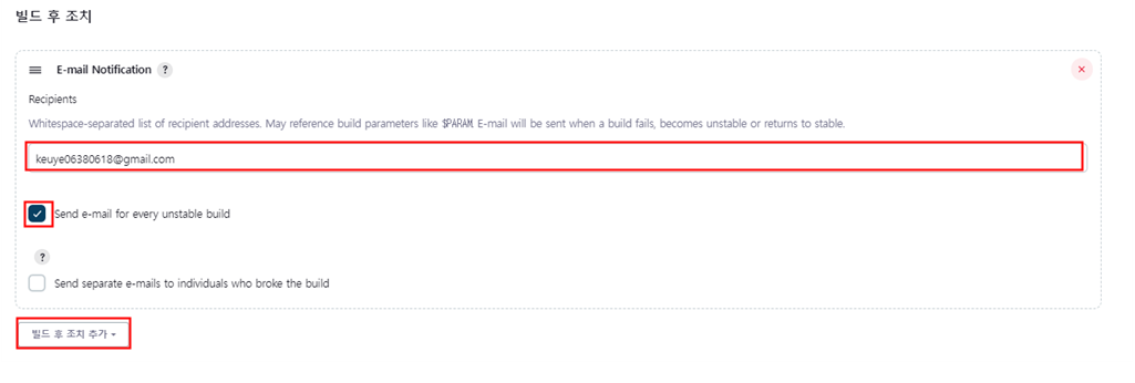 빌드 후 조치로 이동해 줍니다. 그 후 추가버튼을 클릭해 E-maail Notification을선택해 빌드 실패 시 이메일을 통해 알려주도록 합니다.