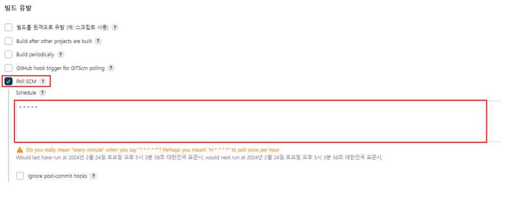 PollSCM 옵션을 클릭합니다 이 옵션은 Jenkins가 소스 코드 저장소(Git, SVN 등)의 변경 사항을 주기적으로 확인하여 변경이 감지되면 빌드를 트리거합니다.