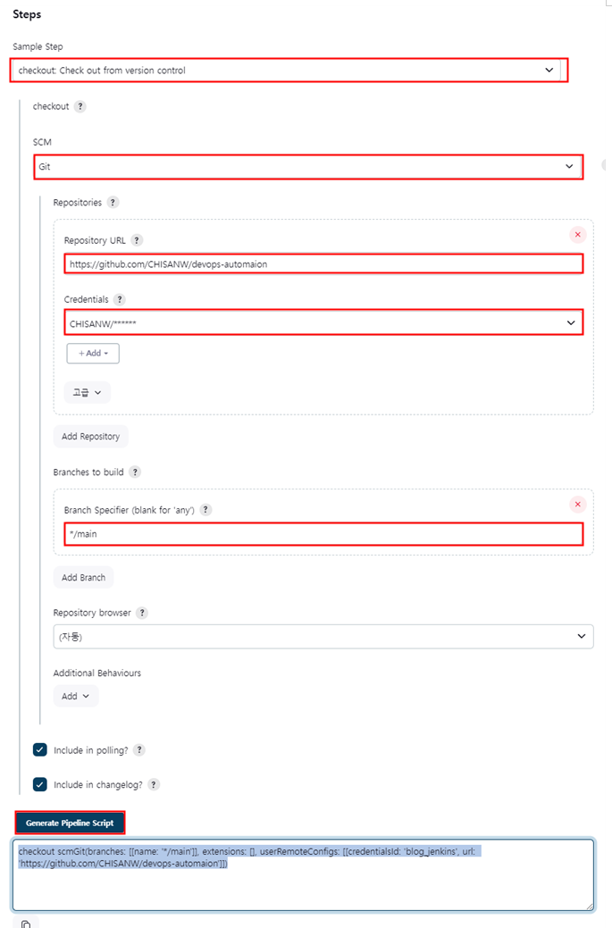 Sample Step : check out.... 클릭 SCM : Git 선택 Repositoryt URL : 사용할 깃 리파지토리 주소 Credentials : 이전에 만들었던 Credentials 사용 Branch Specifier : 사용 중인 브랜치명 Generate Pipeline Script : 스크립트를 생성해 만들어진 스크립트 복사