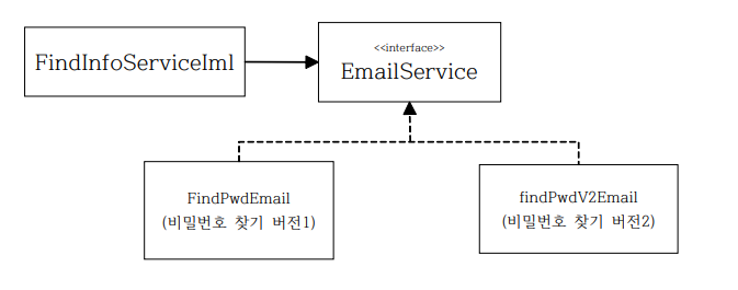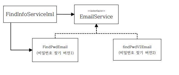 하지만 이렇게 사용한다면 EamilService에도 의존하고 findPwdEmail에도 의존하는 상태가 됩니다. 이러면 DIP을 위배하는 코드가 됩니다. 다음과 같은 상태가 됩니다. 반대로 비밀번호 찾기 버전 2를 했을 때도 DIP를 위배하는 상태가 됩니다.