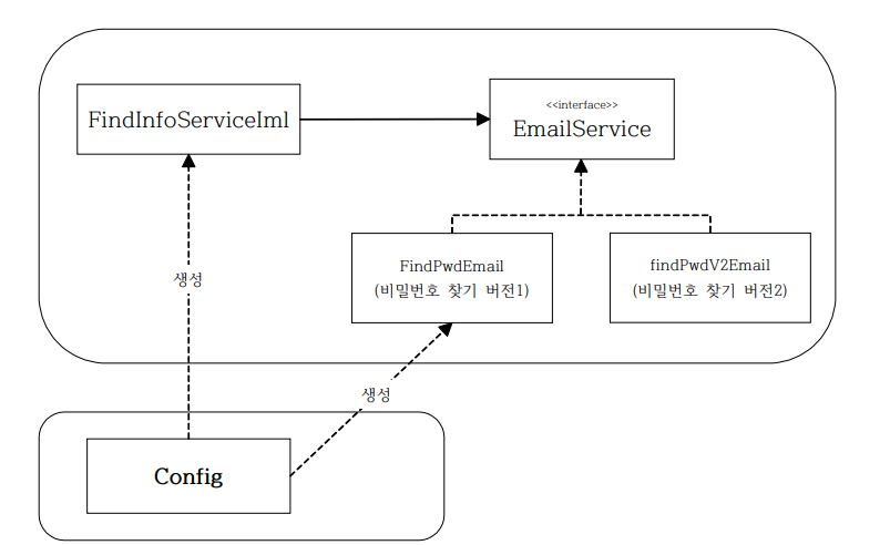 위 그림과 같이 런타임 시에 Config 설정파일이 주입해 주는 다이어그램입니다. findPwdV2 Email을 사용한다면 Config는 findPwdV2Email을 생성해 줍니다.
