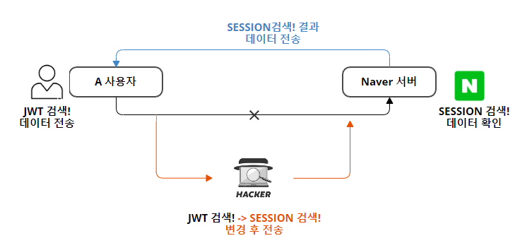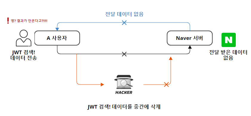 위에 그림처럼 사용자는 "JWT 검색!"을 전송했는데 중간데 해커가 "SESSION 검색!"으로 변경해 네이버 서버로 보내게 된다. 그러면 네이버 서버는 "JWT 검색!"을 전달받는 것이 아닌 중간에 해커가 변경안 "SESSION 검색!"으로 변경해 사용자게에게는 기대했던 JWT 검색이 아닌 SESSION 검색 결고 값을 전달받는 무결성 보안문제가 발생한다.