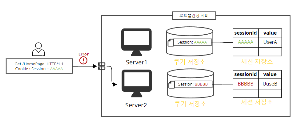 다음과 같이 유저는 Session이 AAAAA라는 값으로 요청을 보냈는데 요청이 로드밸런싱 서버가 Server1이 아닌 Server2으로 처리를 해버렸다 그러면 Server2 쿠키저장소에는 Session:AAAAA라는 값을 가지고 있지 않아 같은 홈페이지인데도 로그인이 되지 않는 오류가 발생할 수 있다.