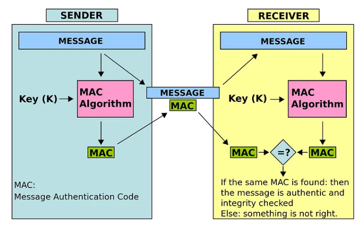 - 그런 다음, B는 새로 생성된 HMAC과 A가 전송한 HMAC을 비교합니다. 만약 두 HMAC이 일치한다면, 이 메시지가 A가 보낸 것임을 증명합니다. 하지만 두 HMAC이 일치하지 않는다면, 중간에 메시지가 변경되었거나 조작되었다는 것을 의미합니다. 이 경우, B는 메시지를 신뢰하지 않고 거부할 수 있습니다.