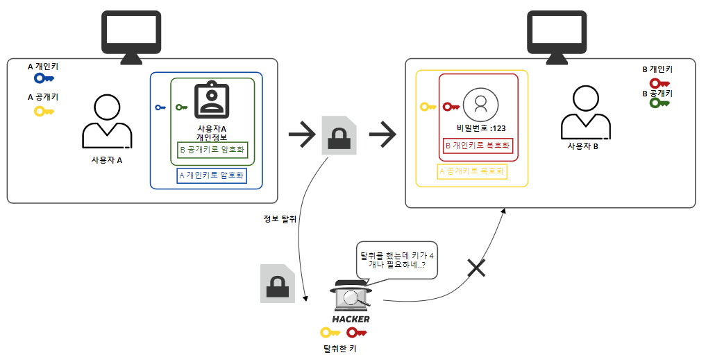 만약 다음과 같이 중간에 해커가 암호화된 데이터를 탈취해 복호화를 진행하려면 일단 2개의 키가 필요하나 만약에 다시 암호화를 해 무결성을 깨지지 않고 B에게 보내려면 키가 4개가 필요합니다. 매우 해커한테는 큰 비용이 발생하기 때문에 보안적으로 안전하다고 할 수 있습니다.