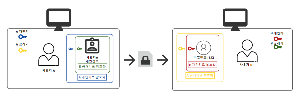 1. B의 공개키를 이용해 사용자 A의 개인정보를 암호화합니다.